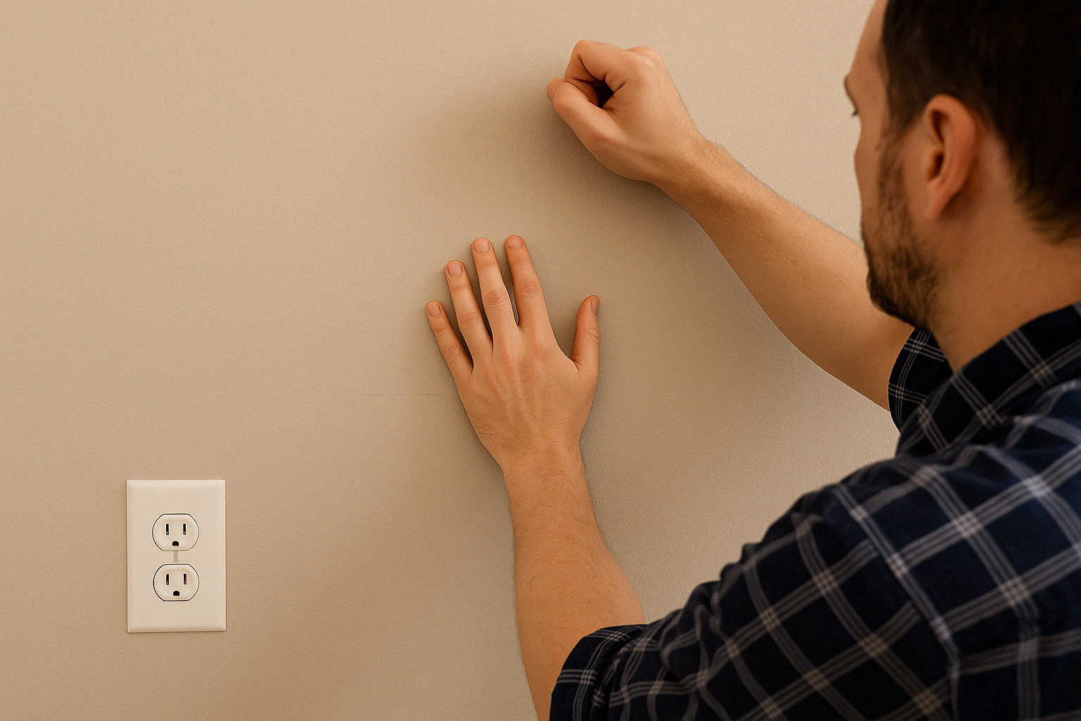 Move horizontally across the wall, knocking every few inches, and pay close attention to the changes in sound. Mark the areas where the sound transitions from hollow to solid, as these points indicate the edges of the studs. Repeat this process vertically to confirm the stud locations and get a better sense of their width.